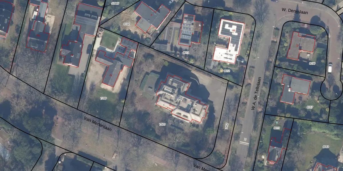 Het perceel waarop Van Merlenlaan 16 staat heeft een oppervlakte van 2843 m². Dit is een zeer groot perceel. De perceeloppervlakte wordt geregistreerd door het Kadaster. Gedetailleerde informatie over de maten van dit perceel kunt u vinden in het rapport Kadastrale kaart met maatvoering van Van Merlenlaan 16.