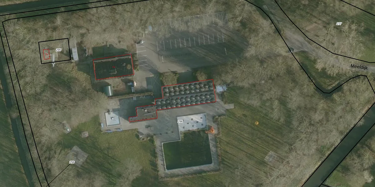Het perceel waarop Meeldijk 7 staat heeft een oppervlakte van 2,0 ha. Dit is een zeer groot perceel. De perceeloppervlakte wordt geregistreerd door het Kadaster. Gedetailleerde informatie over de maten van dit perceel kunt u vinden in het rapport Kadastrale kaart met maatvoering van Meeldijk 7.