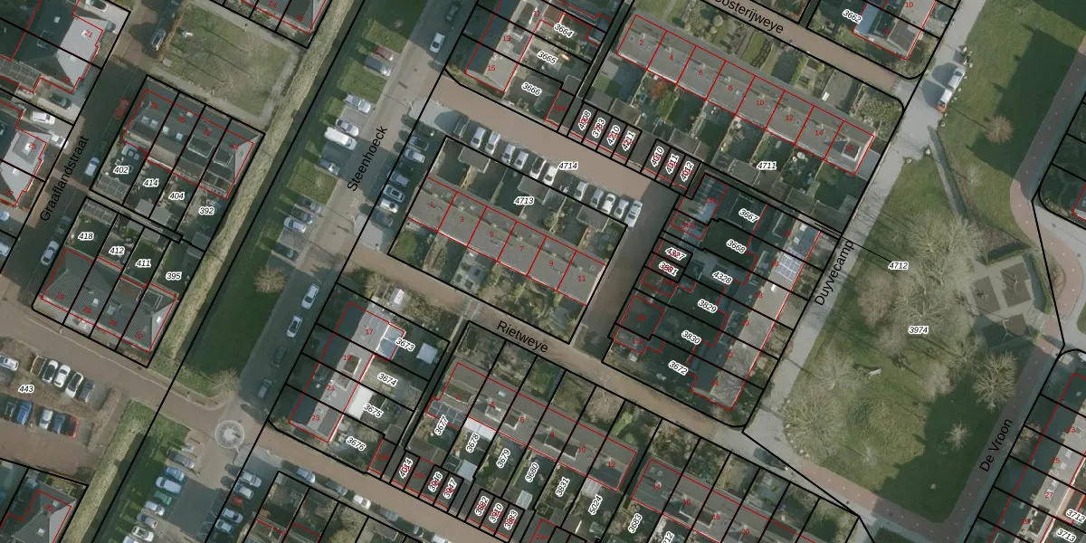 Het perceel waarop Rietweye 9 staat heeft een oppervlakte van 903 m². Dit is een groot perceel. De perceeloppervlakte wordt geregistreerd door het Kadaster. Gedetailleerde informatie over de maten van dit perceel kunt u vinden in het rapport Kadastrale kaart met maatvoering van Rietweye 9.