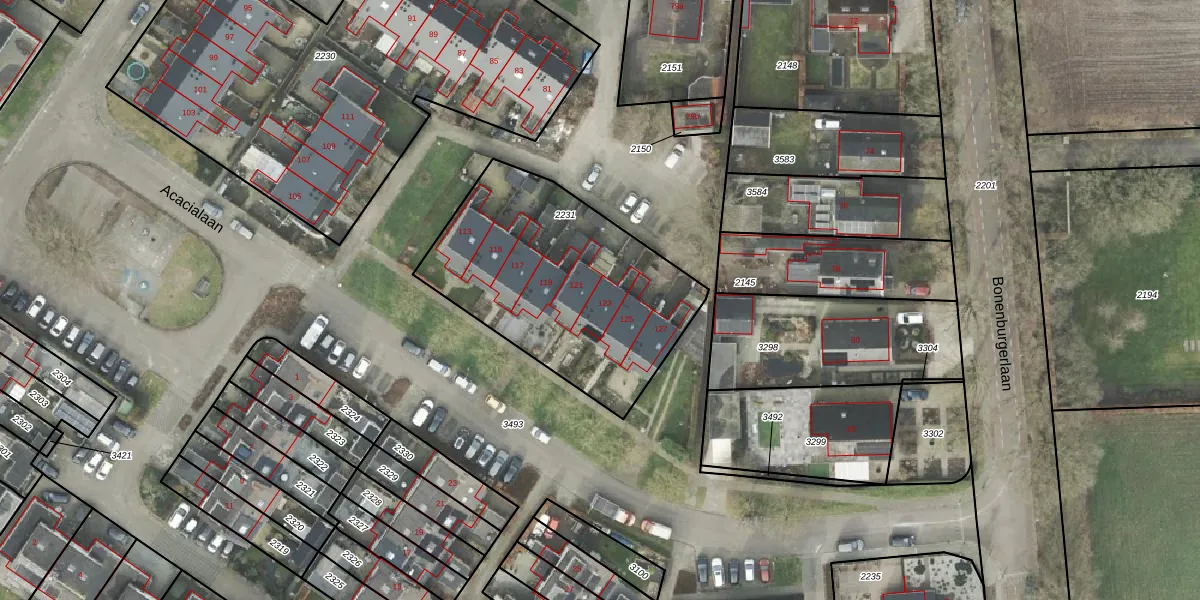 Het perceel waarop Acacialaan 123 staat heeft een oppervlakte van 1090 m². Dit is een zeer groot perceel. De perceeloppervlakte wordt geregistreerd door het Kadaster. Gedetailleerde informatie over de maten van dit perceel kunt u vinden in het rapport Kadastrale kaart met maatvoering van Acacialaan 123.