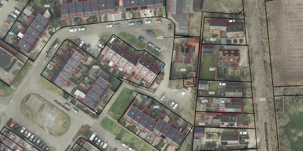 Het perceel waarop Acacialaan 81 staat heeft een oppervlakte van 2165 m². Dit is een zeer groot perceel. De perceeloppervlakte wordt geregistreerd door het Kadaster. Gedetailleerde informatie over de maten van dit perceel kunt u vinden in het rapport Kadastrale kaart met maatvoering van Acacialaan 81.