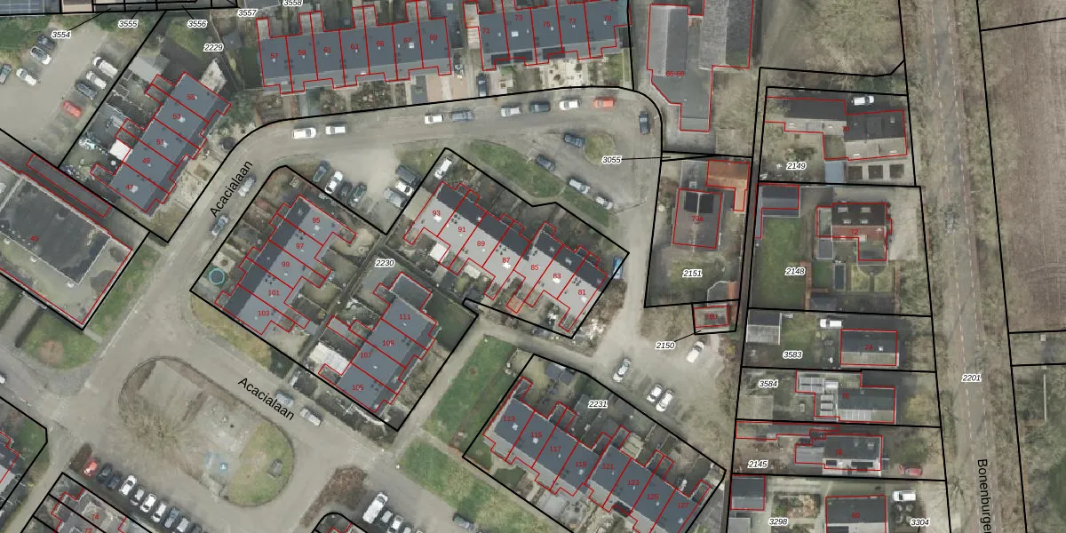 Het perceel waarop Acacialaan 85 staat heeft een oppervlakte van 2165 m². Dit is een zeer groot perceel. De perceeloppervlakte wordt geregistreerd door het Kadaster. Gedetailleerde informatie over de maten van dit perceel kunt u vinden in het rapport Kadastrale kaart met maatvoering van Acacialaan 85.