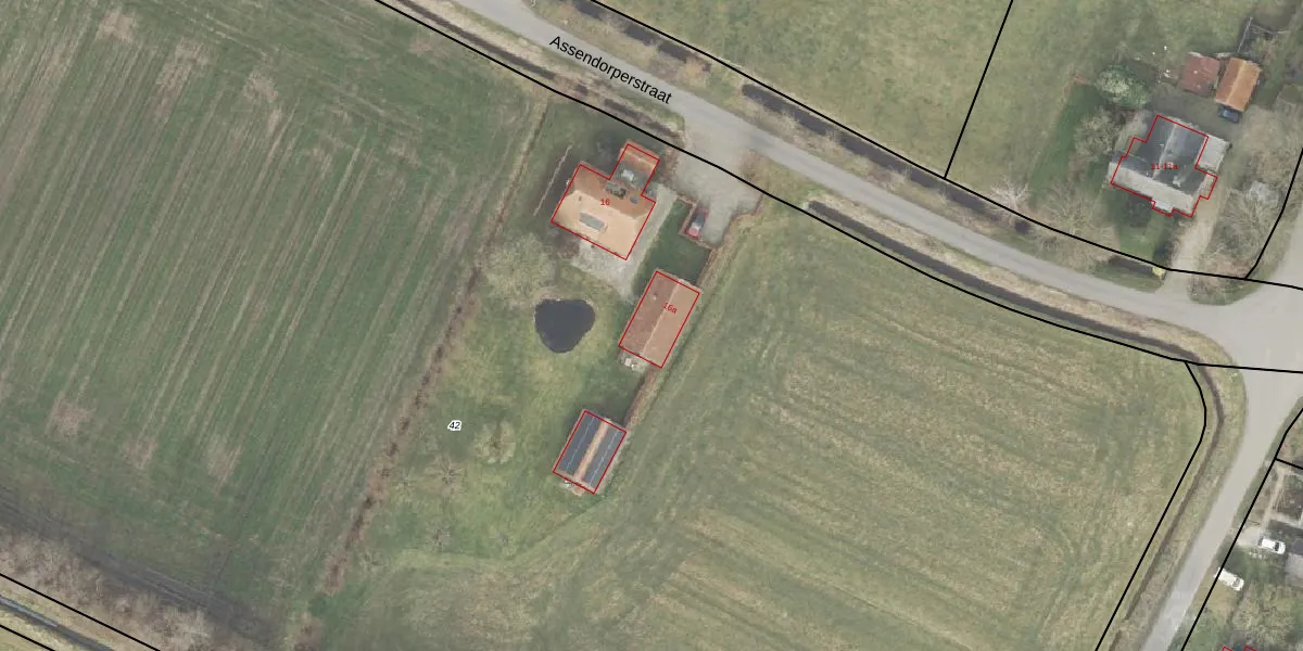 Het perceel waarop Assendorperstraat 16-a staat heeft een oppervlakte van 2,2 ha. Dit is een zeer groot perceel. De perceeloppervlakte wordt geregistreerd door het Kadaster. Gedetailleerde informatie over de maten van dit perceel kunt u vinden in het rapport Kadastrale kaart met maatvoering van Assendorperstraat 16-a.