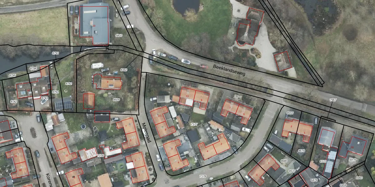 Het perceel waarop Beeklandseweg 11 staat heeft een oppervlakte van 2340 m². Dit is een zeer groot perceel. De perceeloppervlakte wordt geregistreerd door het Kadaster. Gedetailleerde informatie over de maten van dit perceel kunt u vinden in het rapport Kadastrale kaart met maatvoering van Beeklandseweg 11.