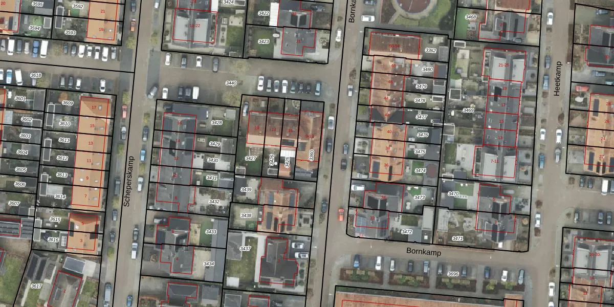 Bornkamp 9 is gelegen op kadastraal perceel HDE00H3360. Deze kadastrale aanduiding is uniek en wordt gebruikt door het Kadaster om eigendomsrechten en andere zakelijke rechten vast te leggen. Het perceel maakt onderdeel uit van de kadastrale gemeente Heerde.