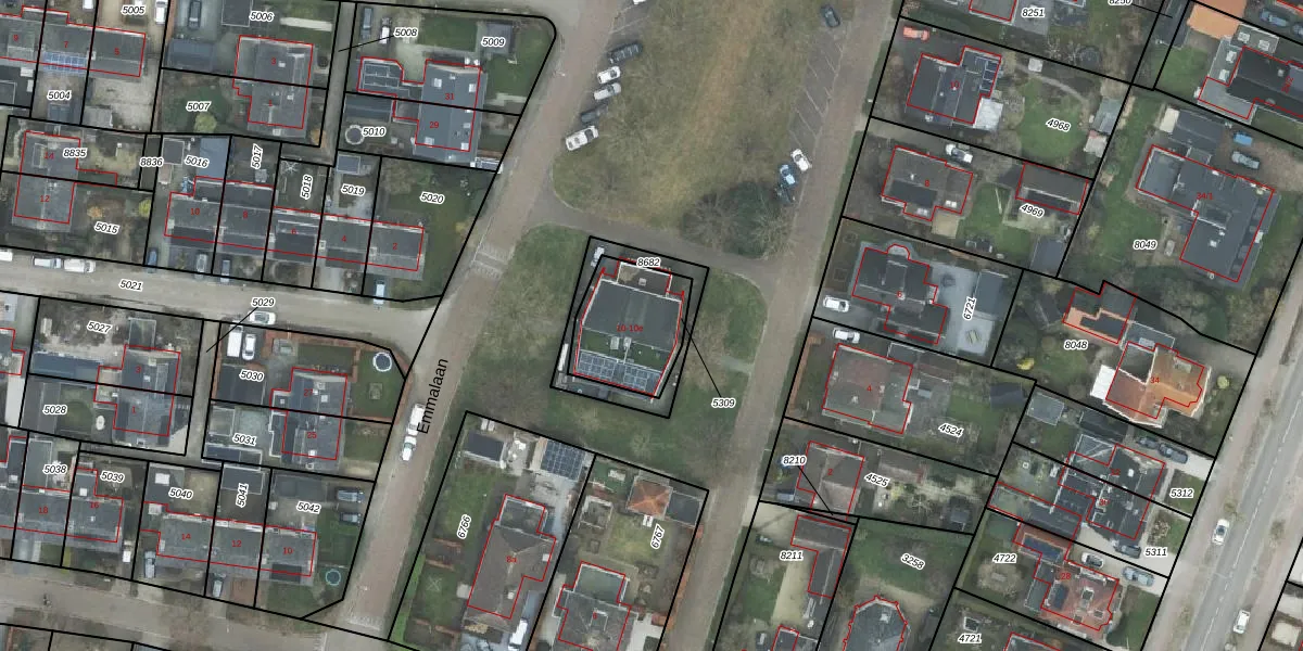 Het perceel waarop Emmalaan 10-b staat heeft een oppervlakte van 300 m². Dit is een groot perceel. De perceeloppervlakte wordt geregistreerd door het Kadaster. Gedetailleerde informatie over de maten van dit perceel kunt u vinden in het rapport Kadastrale kaart met maatvoering van Emmalaan 10-b.
