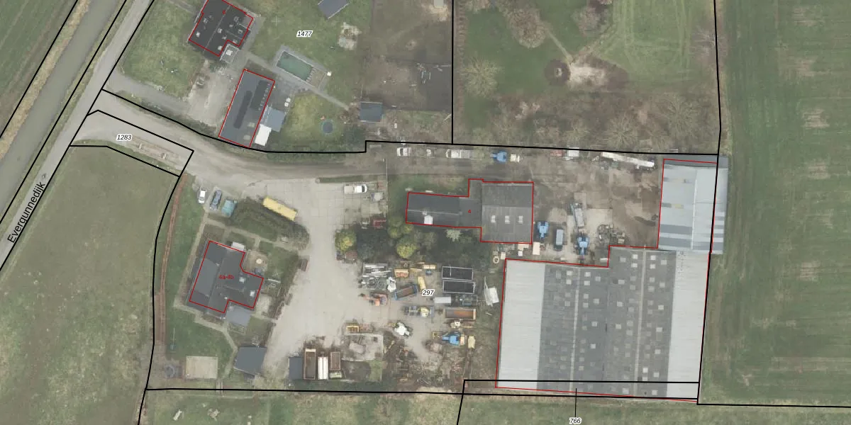 Het perceel waarop Evergunnedijk 4 staat heeft een oppervlakte van 7380 m². Dit is een zeer groot perceel. De perceeloppervlakte wordt geregistreerd door het Kadaster. Gedetailleerde informatie over de maten van dit perceel kunt u vinden in het rapport Kadastrale kaart met maatvoering van Evergunnedijk 4.