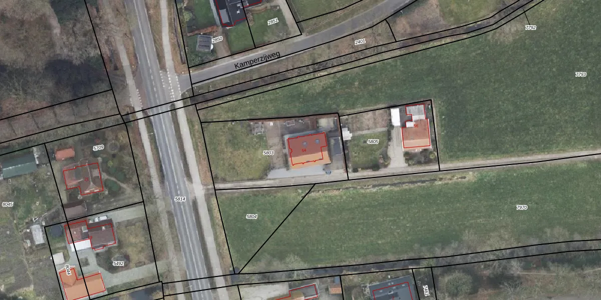 Kamperweg 54 is gelegen op kadastraal perceel HDE00K5803. Deze kadastrale aanduiding is uniek en wordt gebruikt door het Kadaster om eigendomsrechten en andere zakelijke rechten vast te leggen. Het perceel maakt onderdeel uit van de kadastrale gemeente Heerde.