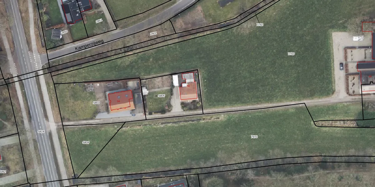 Kamperweg 56 is gelegen op kadastraal perceel HDE00K5805. Deze kadastrale aanduiding is uniek en wordt gebruikt door het Kadaster om eigendomsrechten en andere zakelijke rechten vast te leggen. Het perceel maakt onderdeel uit van de kadastrale gemeente Heerde.