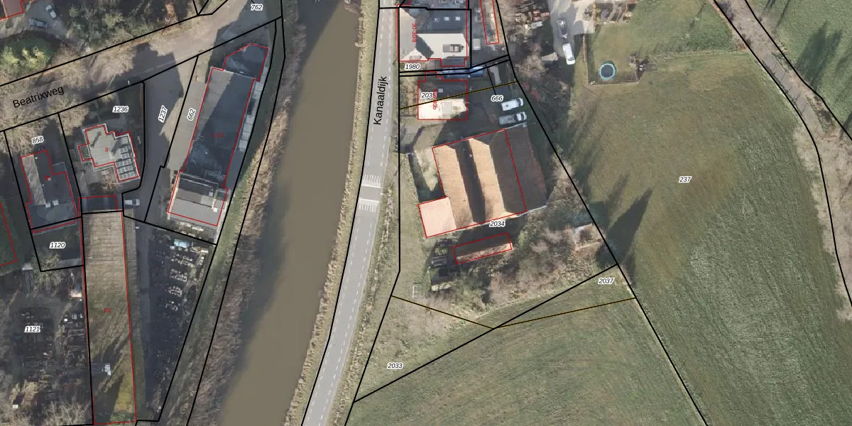 Het perceel waarop Kanaaldijk 30-j staat heeft een oppervlakte van 2071 m². Dit is een zeer groot perceel. De perceeloppervlakte wordt geregistreerd door het Kadaster. Gedetailleerde informatie over de maten van dit perceel kunt u vinden in het rapport Kadastrale kaart met maatvoering van Kanaaldijk 30-j.