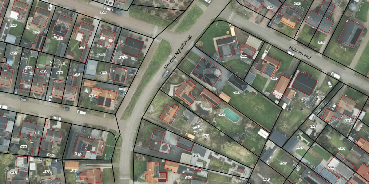 Het perceel waarop Meester Nijhoffstraat 14 staat heeft een oppervlakte van 953 m². Dit is een groot perceel. De perceeloppervlakte wordt geregistreerd door het Kadaster. Gedetailleerde informatie over de maten van dit perceel kunt u vinden in het rapport Kadastrale kaart met maatvoering van Meester Nijhoffstraat 14.