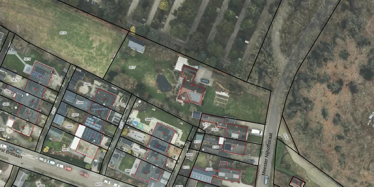 Het perceel waarop Meester Nijhoffstraat 33 staat heeft een oppervlakte van 2370 m². Dit is een zeer groot perceel. De perceeloppervlakte wordt geregistreerd door het Kadaster. Gedetailleerde informatie over de maten van dit perceel kunt u vinden in het rapport Kadastrale kaart met maatvoering van Meester Nijhoffstraat 33.