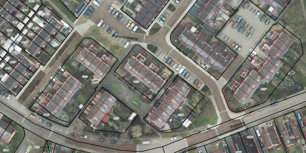 Het perceel waarop Rooboerskamp 34 staat heeft een oppervlakte van 727 m². Dit is een groot perceel. De perceeloppervlakte wordt geregistreerd door het Kadaster. Gedetailleerde informatie over de maten van dit perceel kunt u vinden in het rapport Kadastrale kaart met maatvoering van Rooboerskamp 34.