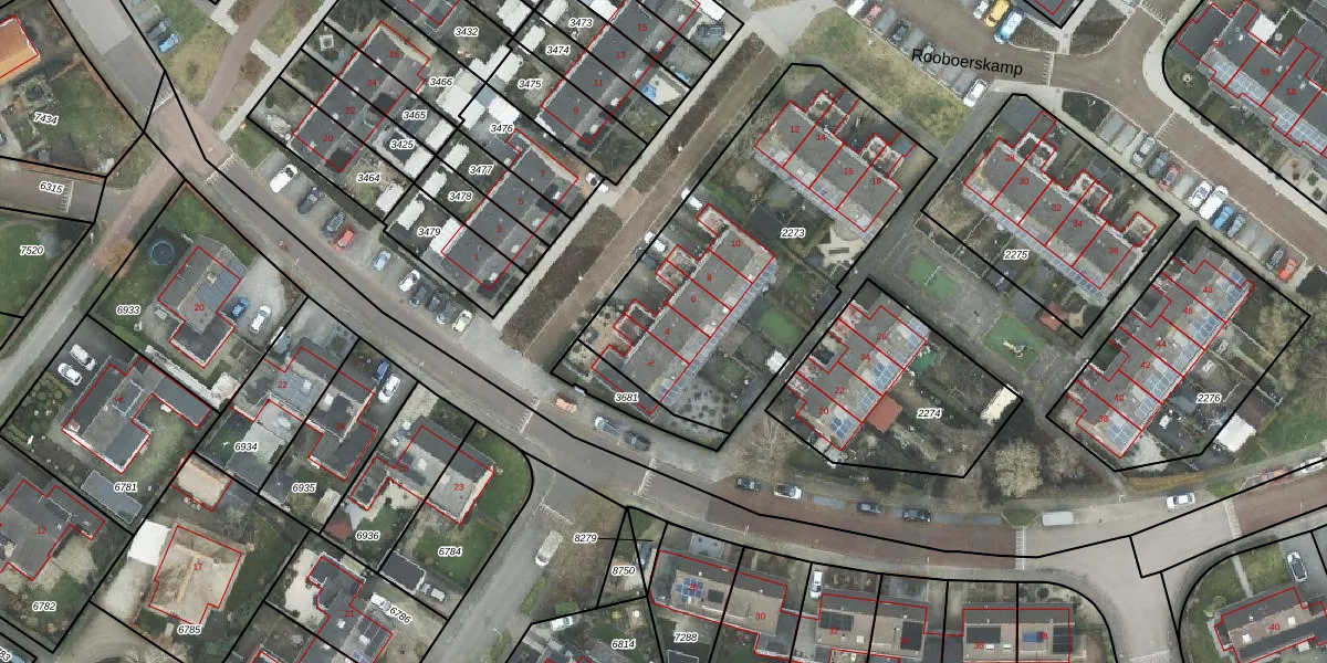Het perceel waarop Rooboerskamp 4 staat heeft een oppervlakte van 1434 m². Dit is een zeer groot perceel. De perceeloppervlakte wordt geregistreerd door het Kadaster. Gedetailleerde informatie over de maten van dit perceel kunt u vinden in het rapport Kadastrale kaart met maatvoering van Rooboerskamp 4.