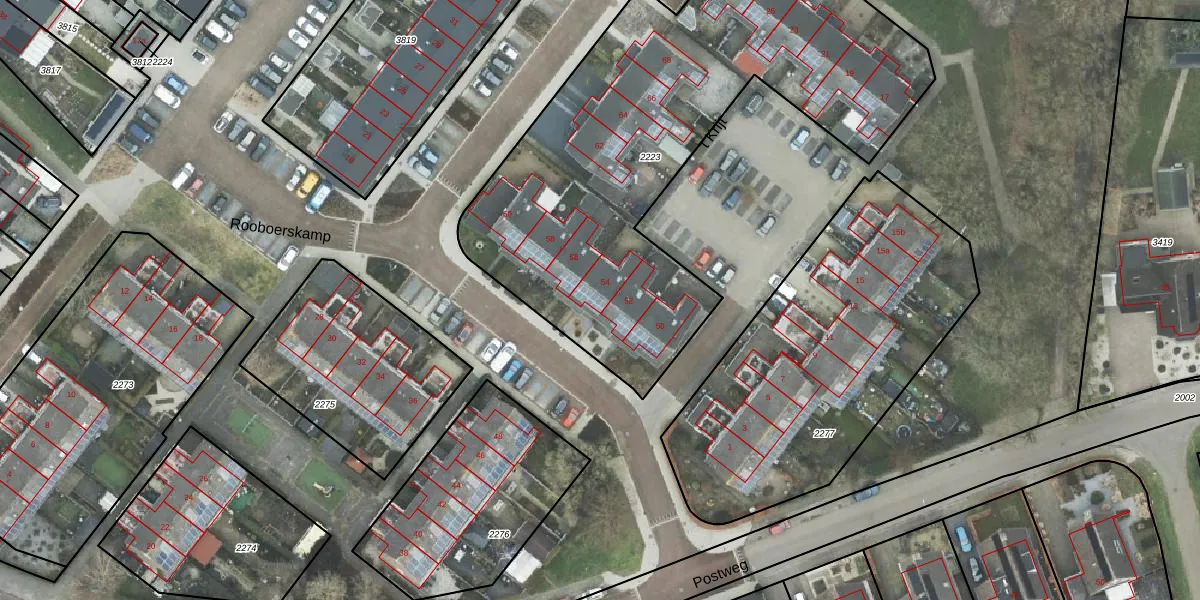 Rooboerskamp 54 is gelegen op kadastraal perceel HDE00B2223. Deze kadastrale aanduiding is uniek en wordt gebruikt door het Kadaster om eigendomsrechten en andere zakelijke rechten vast te leggen. Het perceel maakt onderdeel uit van de kadastrale gemeente Heerde.