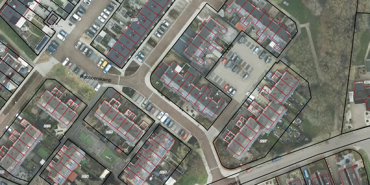 Het perceel waarop Rooboerskamp 56 staat heeft een oppervlakte van 2510 m². Dit is een zeer groot perceel. De perceeloppervlakte wordt geregistreerd door het Kadaster. Gedetailleerde informatie over de maten van dit perceel kunt u vinden in het rapport Kadastrale kaart met maatvoering van Rooboerskamp 56.