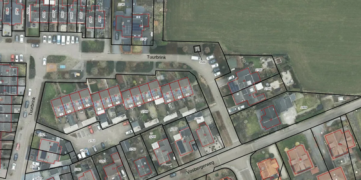 Het perceel waarop Tuurbrink 30 staat heeft een oppervlakte van 2420 m². Dit is een zeer groot perceel. De perceeloppervlakte wordt geregistreerd door het Kadaster. Gedetailleerde informatie over de maten van dit perceel kunt u vinden in het rapport Kadastrale kaart met maatvoering van Tuurbrink 30.