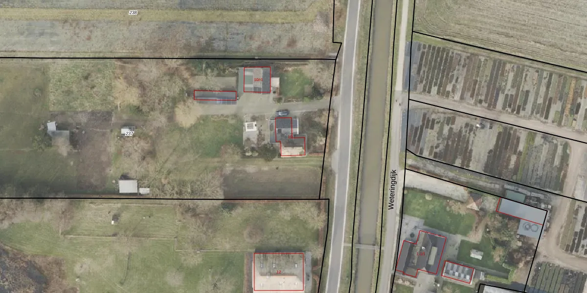 Weteringdijk 10 is gelegen op kadastraal perceel HDE00P237. Deze kadastrale aanduiding is uniek en wordt gebruikt door het Kadaster om eigendomsrechten en andere zakelijke rechten vast te leggen. Het perceel maakt onderdeel uit van de kadastrale gemeente Heerde.