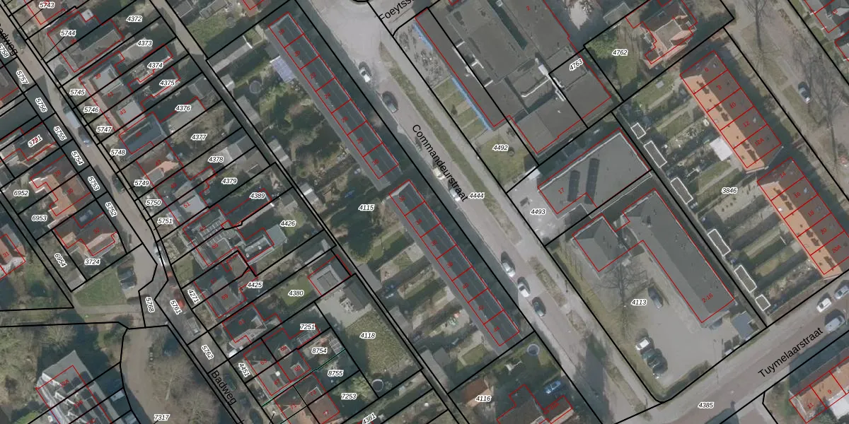 Het perceel waarop Commandeurstraat 34 staat heeft een oppervlakte van 2470 m². Dit is een zeer groot perceel. De perceeloppervlakte wordt geregistreerd door het Kadaster. Gedetailleerde informatie over de maten van dit perceel kunt u vinden in het rapport Kadastrale kaart met maatvoering van Commandeurstraat 34.