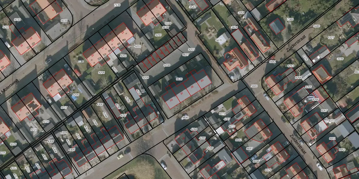Het perceel waarop Zuiderstraat 2-F staat heeft een oppervlakte van 772 m². Dit is een groot perceel. De perceeloppervlakte wordt geregistreerd door het Kadaster. Gedetailleerde informatie over de maten van dit perceel kunt u vinden in het rapport Kadastrale kaart met maatvoering van Zuiderstraat 2-F.