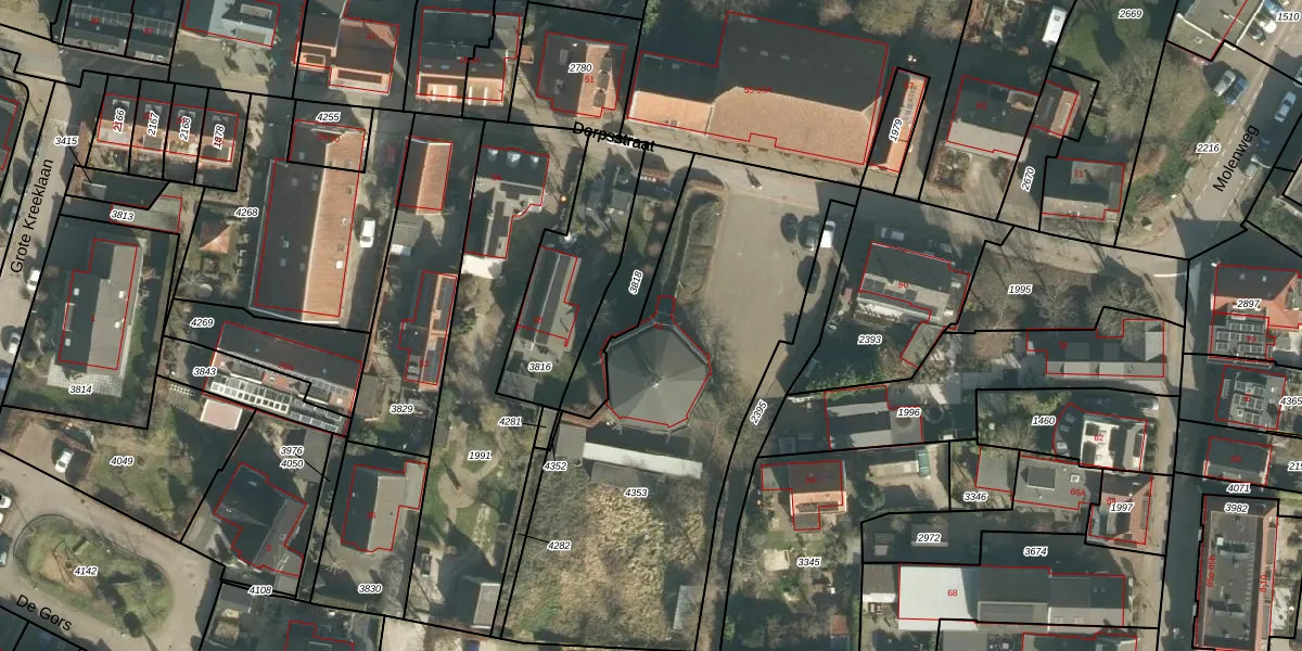 Het perceel waarop Dorpsstraat 44 staat heeft een oppervlakte van 1952 m². Dit is een zeer groot perceel. De perceeloppervlakte wordt geregistreerd door het Kadaster. Gedetailleerde informatie over de maten van dit perceel kunt u vinden in het rapport Kadastrale kaart met maatvoering van Dorpsstraat 44.