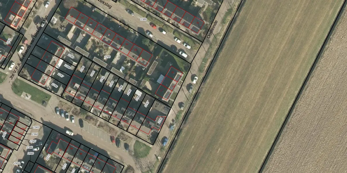 Het perceel waarop Oosteinde 19 staat heeft een oppervlakte van 2320 m². Dit is een zeer groot perceel. De perceeloppervlakte wordt geregistreerd door het Kadaster. Gedetailleerde informatie over de maten van dit perceel kunt u vinden in het rapport Kadastrale kaart met maatvoering van Oosteinde 19.