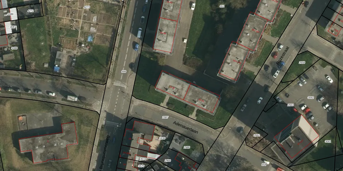 Het perceel waarop Adenauerlaan 33 staat heeft een oppervlakte van 9020 m². Dit is een zeer groot perceel. De perceeloppervlakte wordt geregistreerd door het Kadaster. Gedetailleerde informatie over de maten van dit perceel kunt u vinden in het rapport Kadastrale kaart met maatvoering van Adenauerlaan 33.