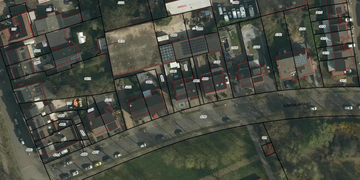 Adenauerlaan 9 is gelegen op kadastraal perceel HLN01O1942. Deze kadastrale aanduiding is uniek en wordt gebruikt door het Kadaster om eigendomsrechten en andere zakelijke rechten vast te leggen. Het perceel maakt onderdeel uit van de kadastrale gemeente Heerlen.