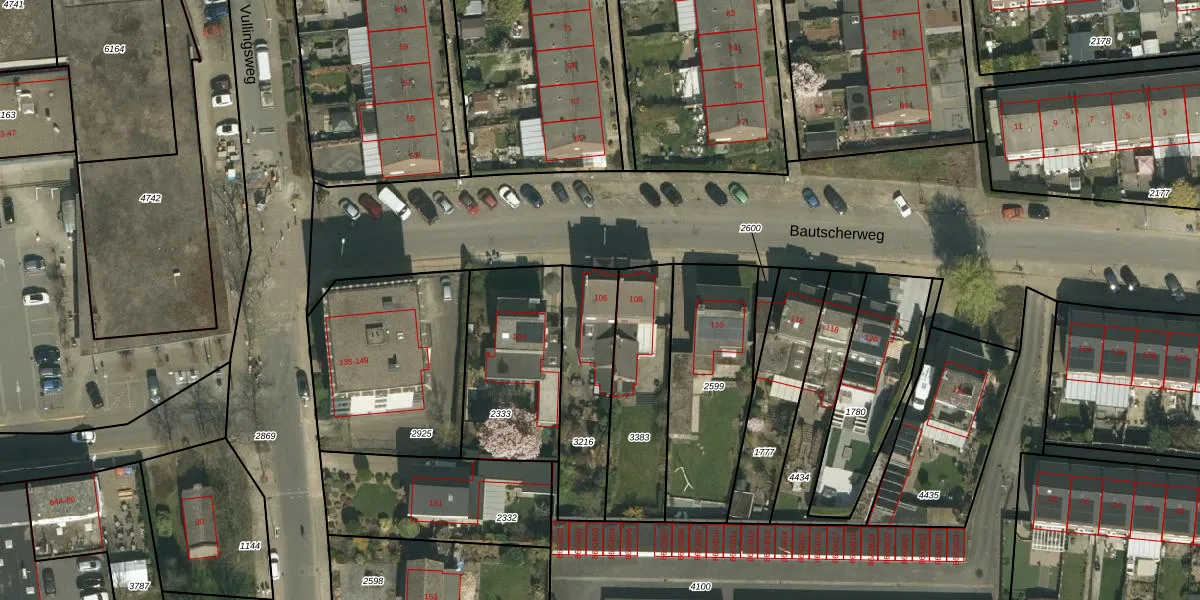Het perceel waarop Bautscherweg 106 staat heeft een oppervlakte van 365 m². Dit is een groot perceel. De perceeloppervlakte wordt geregistreerd door het Kadaster. Gedetailleerde informatie over de maten van dit perceel kunt u vinden in het rapport Kadastrale kaart met maatvoering van Bautscherweg 106.
