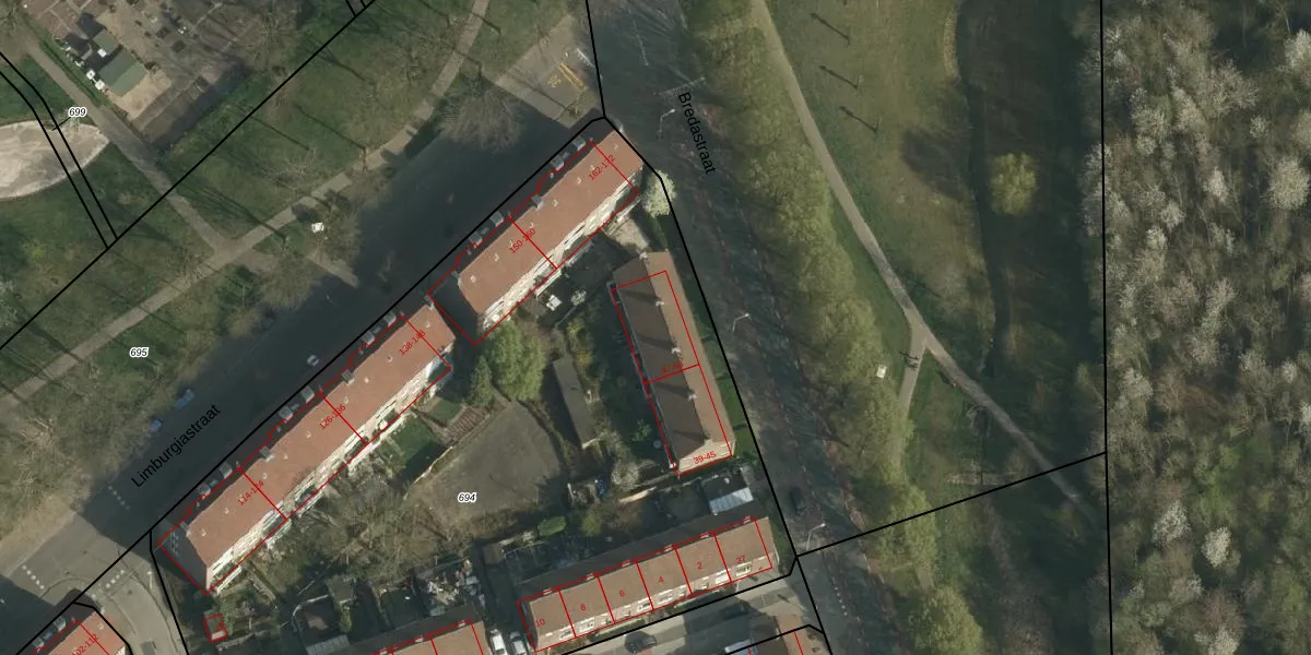 Bredastraat 51 is gelegen op kadastraal perceel HLN01M694. Deze kadastrale aanduiding is uniek en wordt gebruikt door het Kadaster om eigendomsrechten en andere zakelijke rechten vast te leggen. Het perceel maakt onderdeel uit van de kadastrale gemeente Heerlen.