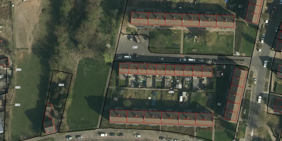 Het perceel waarop De Ruyterstraat 15 staat heeft een oppervlakte van 4850 m². Dit is een zeer groot perceel. De perceeloppervlakte wordt geregistreerd door het Kadaster. Gedetailleerde informatie over de maten van dit perceel kunt u vinden in het rapport Kadastrale kaart met maatvoering van De Ruyterstraat 15.
