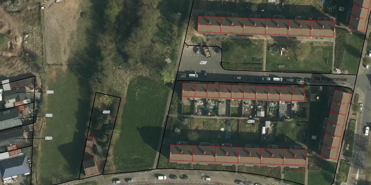 Het perceel waarop De Ruyterstraat 19 staat heeft een oppervlakte van 4850 m². Dit is een zeer groot perceel. De perceeloppervlakte wordt geregistreerd door het Kadaster. Gedetailleerde informatie over de maten van dit perceel kunt u vinden in het rapport Kadastrale kaart met maatvoering van De Ruyterstraat 19.