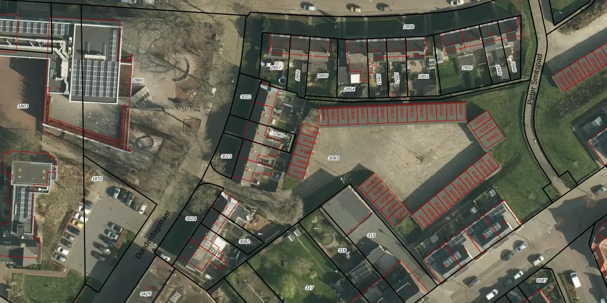 Het perceel waarop Donderdagstraat 9-GB03 staat heeft een oppervlakte van 4770 m². Dit is een zeer groot perceel. De perceeloppervlakte wordt geregistreerd door het Kadaster. Gedetailleerde informatie over de maten van dit perceel kunt u vinden in het rapport Kadastrale kaart met maatvoering van Donderdagstraat 9-GB03.