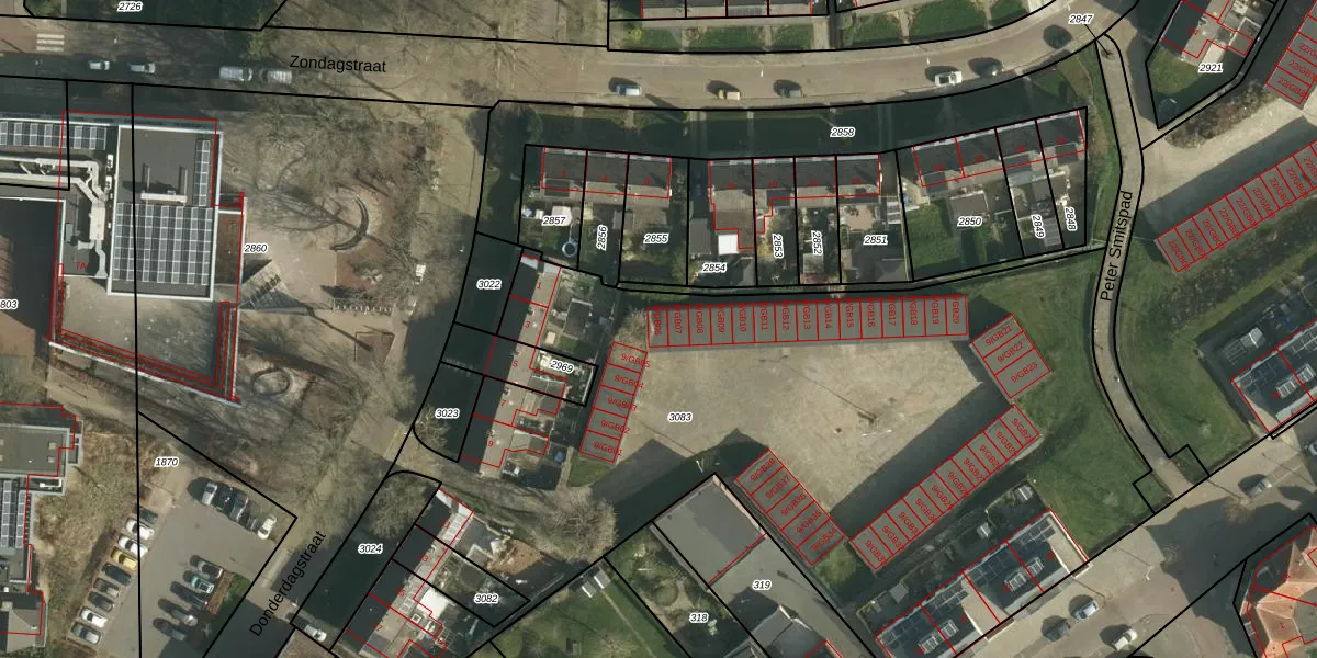 Het perceel waarop Donderdagstraat 9-GB06 staat heeft een oppervlakte van 4770 m². Dit is een zeer groot perceel. De perceeloppervlakte wordt geregistreerd door het Kadaster. Gedetailleerde informatie over de maten van dit perceel kunt u vinden in het rapport Kadastrale kaart met maatvoering van Donderdagstraat 9-GB06.