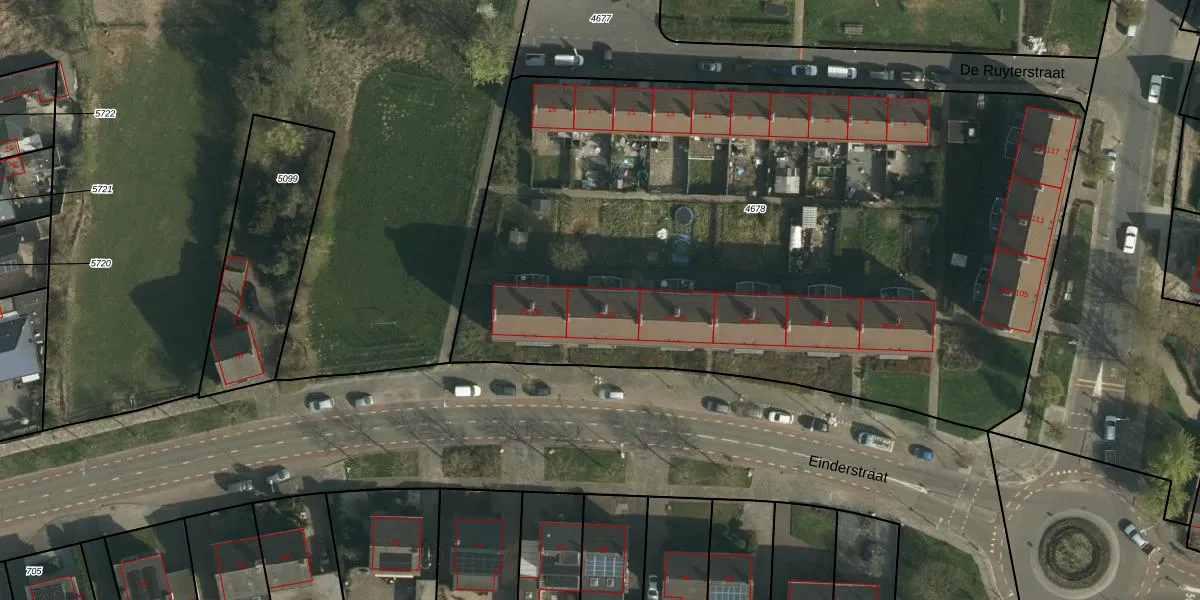 Het perceel waarop Einderstraat 33 staat heeft een oppervlakte van 4850 m². Dit is een zeer groot perceel. De perceeloppervlakte wordt geregistreerd door het Kadaster. Gedetailleerde informatie over de maten van dit perceel kunt u vinden in het rapport Kadastrale kaart met maatvoering van Einderstraat 33.