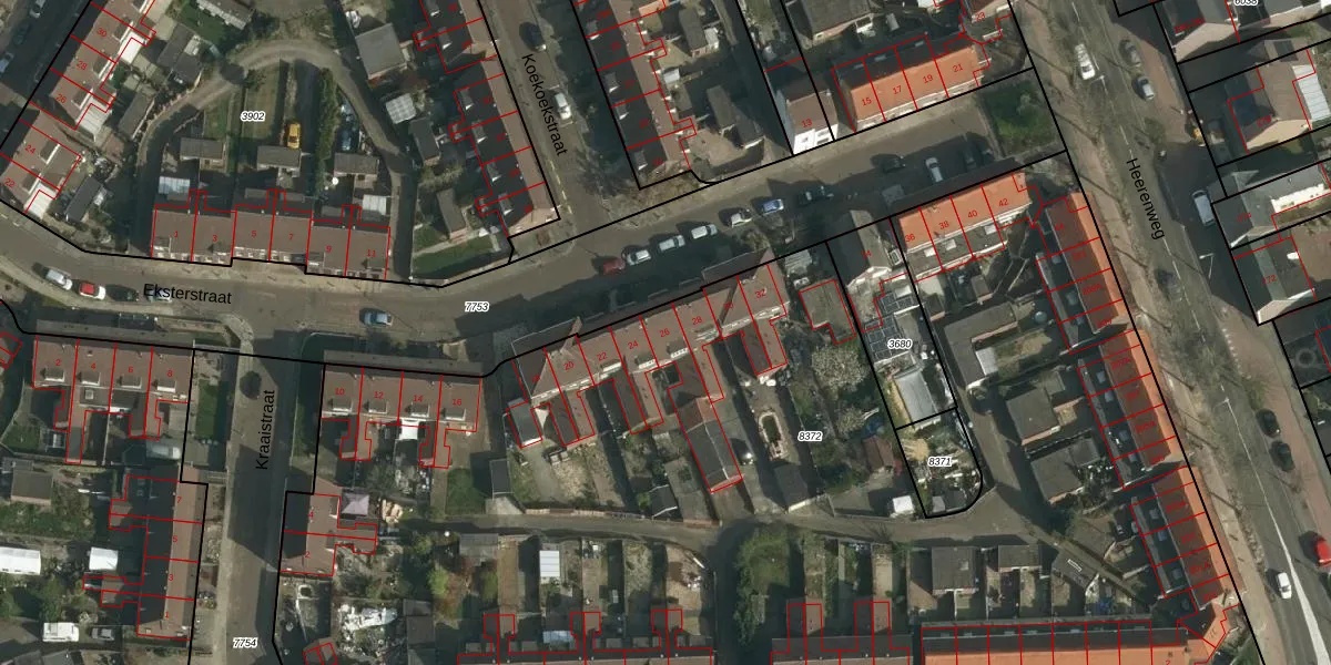 Eksterstraat 26 is gelegen op kadastraal perceel HLN01B8372. Deze kadastrale aanduiding is uniek en wordt gebruikt door het Kadaster om eigendomsrechten en andere zakelijke rechten vast te leggen. Het perceel maakt onderdeel uit van de kadastrale gemeente Heerlen.