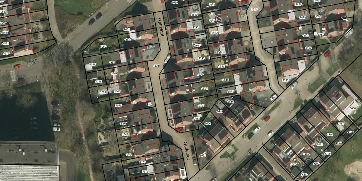 Het perceel waarop Gaffelhof 15 staat heeft een oppervlakte van 253 m². Dit is een middelgroot perceel. De perceeloppervlakte wordt geregistreerd door het Kadaster. Gedetailleerde informatie over de maten van dit perceel kunt u vinden in het rapport Kadastrale kaart met maatvoering van Gaffelhof 15.