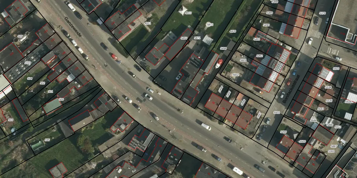 Gebruik de zoekbalk of klik op een perceel voor informatie over de adressen binnen dit perceel.