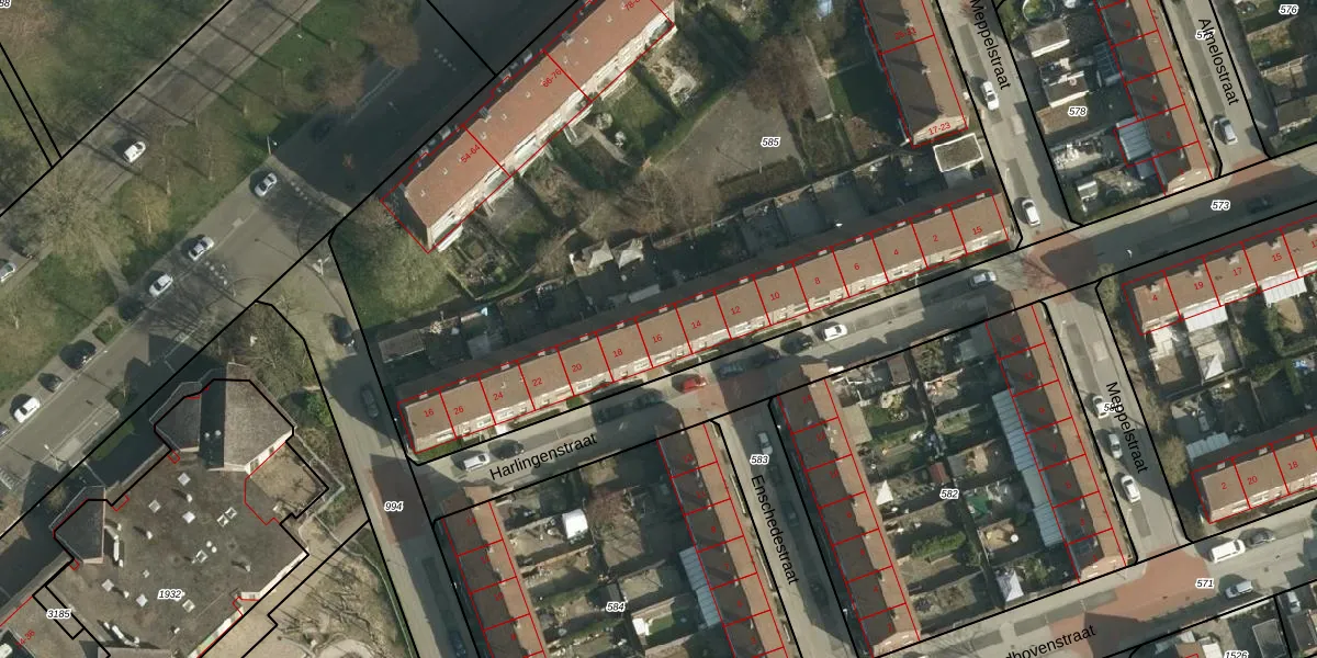 Harlingenstraat 16 is gelegen op kadastraal perceel HLN01M585. Deze kadastrale aanduiding is uniek en wordt gebruikt door het Kadaster om eigendomsrechten en andere zakelijke rechten vast te leggen. Het perceel maakt onderdeel uit van de kadastrale gemeente Heerlen.