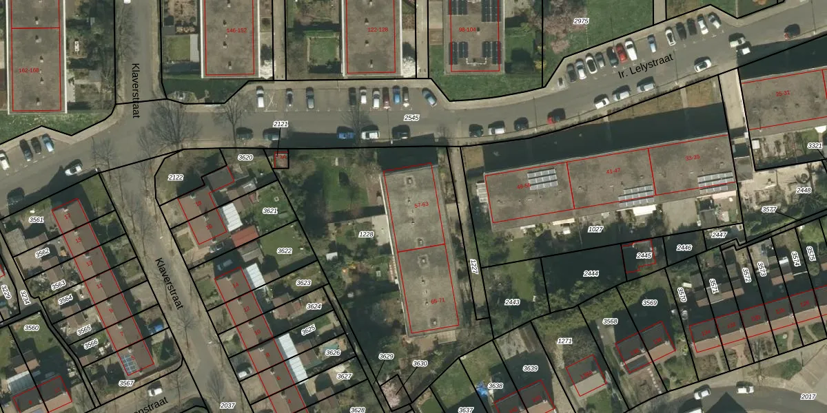 Het perceel waarop Ir. Lelystraat 61 staat heeft een oppervlakte van 1962 m². Dit is een zeer groot perceel. De perceeloppervlakte wordt geregistreerd door het Kadaster. Gedetailleerde informatie over de maten van dit perceel kunt u vinden in het rapport Kadastrale kaart met maatvoering van Ir. Lelystraat 61.