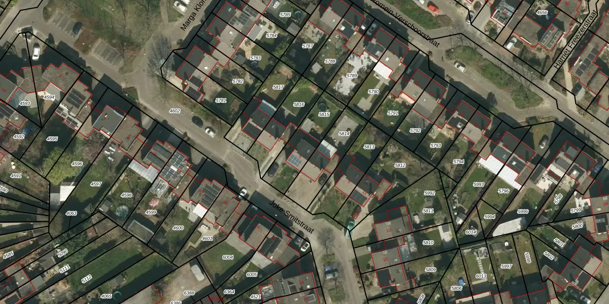 Joke Smitstraat 5 is gelegen op kadastraal perceel HLN01K5815. Deze kadastrale aanduiding is uniek en wordt gebruikt door het Kadaster om eigendomsrechten en andere zakelijke rechten vast te leggen. Het perceel maakt onderdeel uit van de kadastrale gemeente Heerlen.