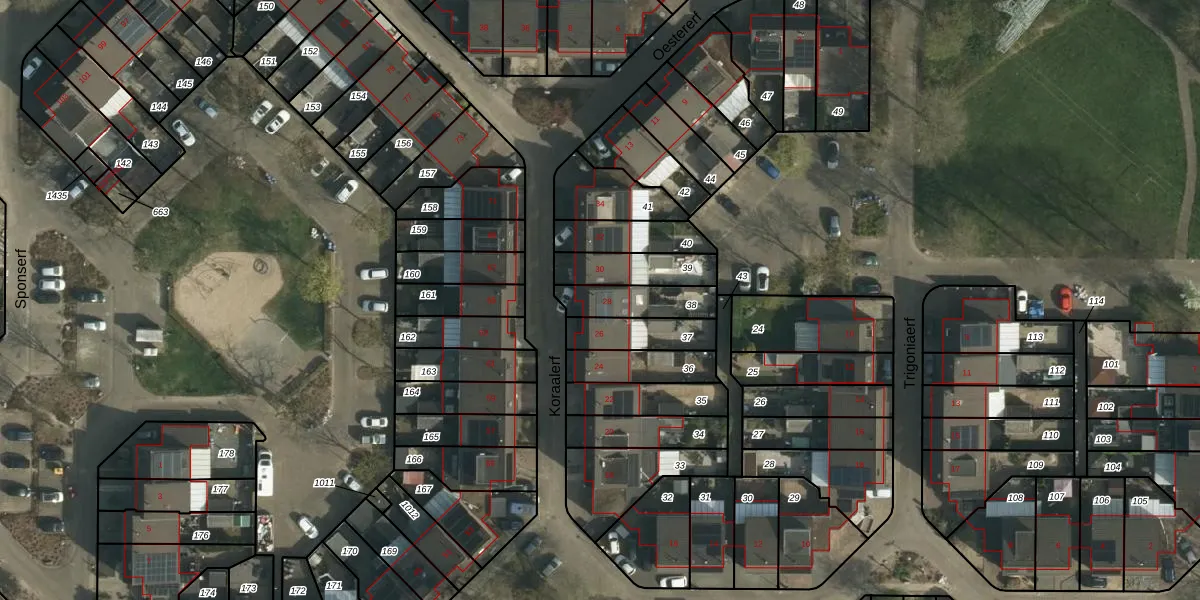 Het perceel waarop Koraalerf 28 staat heeft een oppervlakte van 141 m². Dit is een middelgroot perceel. De perceeloppervlakte wordt geregistreerd door het Kadaster. Gedetailleerde informatie over de maten van dit perceel kunt u vinden in het rapport Kadastrale kaart met maatvoering van Koraalerf 28.