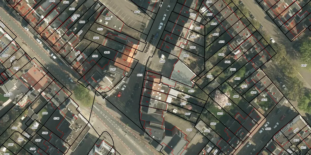 Het perceel waarop Nobelstraat 63-B staat heeft een oppervlakte van 55 m². Dit is een klein perceel. De perceeloppervlakte wordt geregistreerd door het Kadaster. Gedetailleerde informatie over de maten van dit perceel kunt u vinden in het rapport Kadastrale kaart met maatvoering van Nobelstraat 63-B.