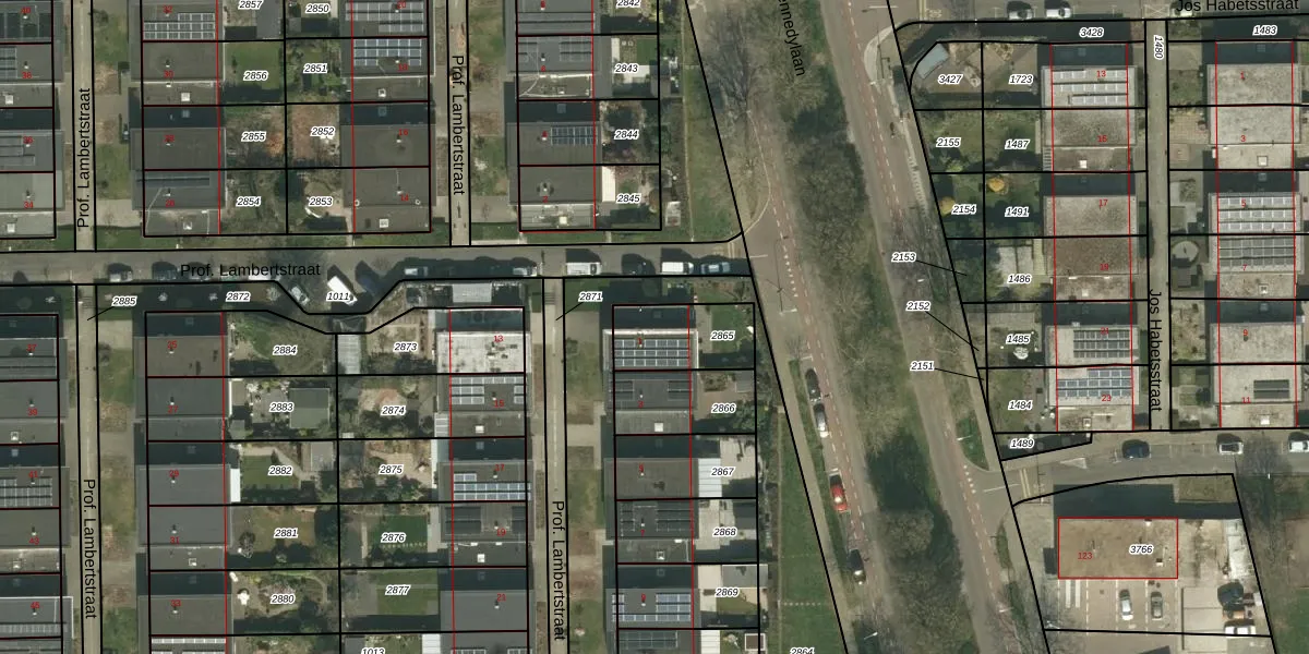 Prof. Lambertstraat 1 is gelegen op kadastraal perceel HLN01H2865. Deze kadastrale aanduiding is uniek en wordt gebruikt door het Kadaster om eigendomsrechten en andere zakelijke rechten vast te leggen. Het perceel maakt onderdeel uit van de kadastrale gemeente Heerlen.