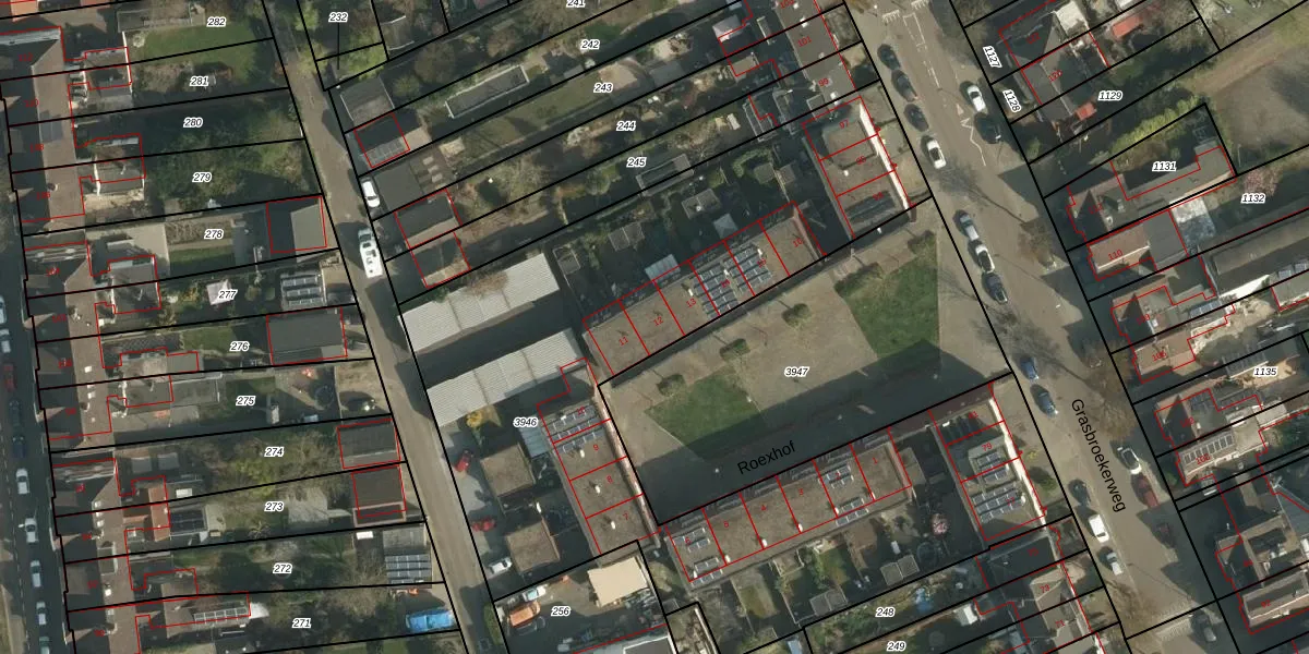 Het perceel waarop Roexhof 12 staat heeft een oppervlakte van 3910 m². Dit is een zeer groot perceel. De perceeloppervlakte wordt geregistreerd door het Kadaster. Gedetailleerde informatie over de maten van dit perceel kunt u vinden in het rapport Kadastrale kaart met maatvoering van Roexhof 12.