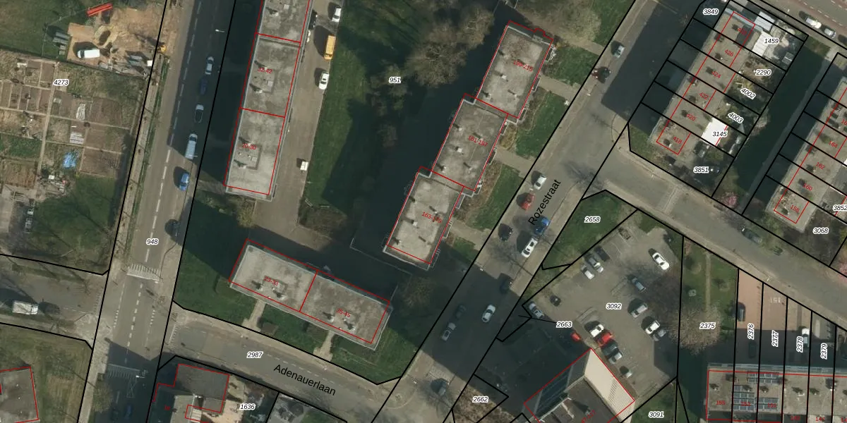 Het perceel waarop Rozestraat 169 staat heeft een oppervlakte van 9020 m². Dit is een zeer groot perceel. De perceeloppervlakte wordt geregistreerd door het Kadaster. Gedetailleerde informatie over de maten van dit perceel kunt u vinden in het rapport Kadastrale kaart met maatvoering van Rozestraat 169.