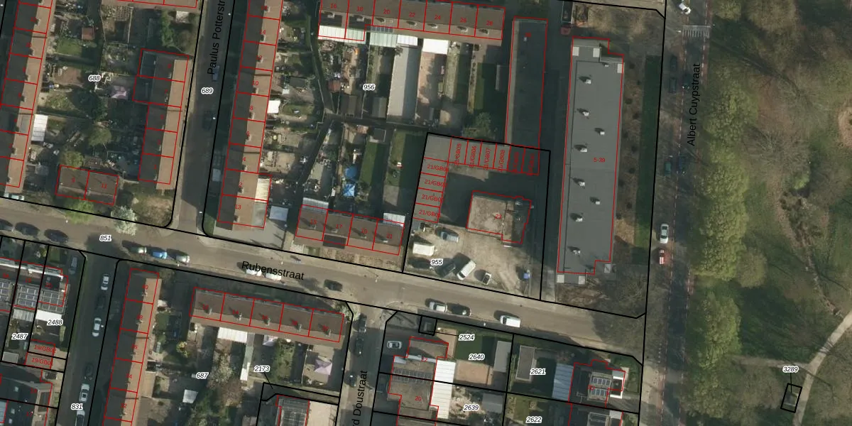 Rubensstraat 21-GB01 is gelegen op kadastraal perceel HLN01M955. Deze kadastrale aanduiding is uniek en wordt gebruikt door het Kadaster om eigendomsrechten en andere zakelijke rechten vast te leggen. Het perceel maakt onderdeel uit van de kadastrale gemeente Heerlen.