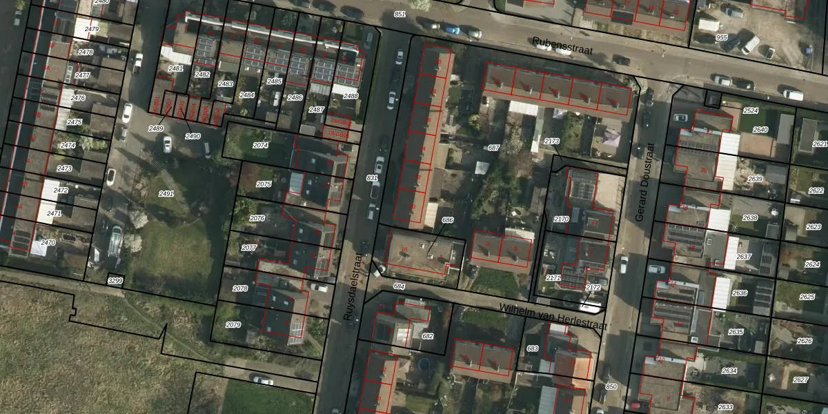 Het perceel waarop Ruysdaelstraat 30 staat heeft een oppervlakte van 2410 m². Dit is een zeer groot perceel. De perceeloppervlakte wordt geregistreerd door het Kadaster. Gedetailleerde informatie over de maten van dit perceel kunt u vinden in het rapport Kadastrale kaart met maatvoering van Ruysdaelstraat 30.
