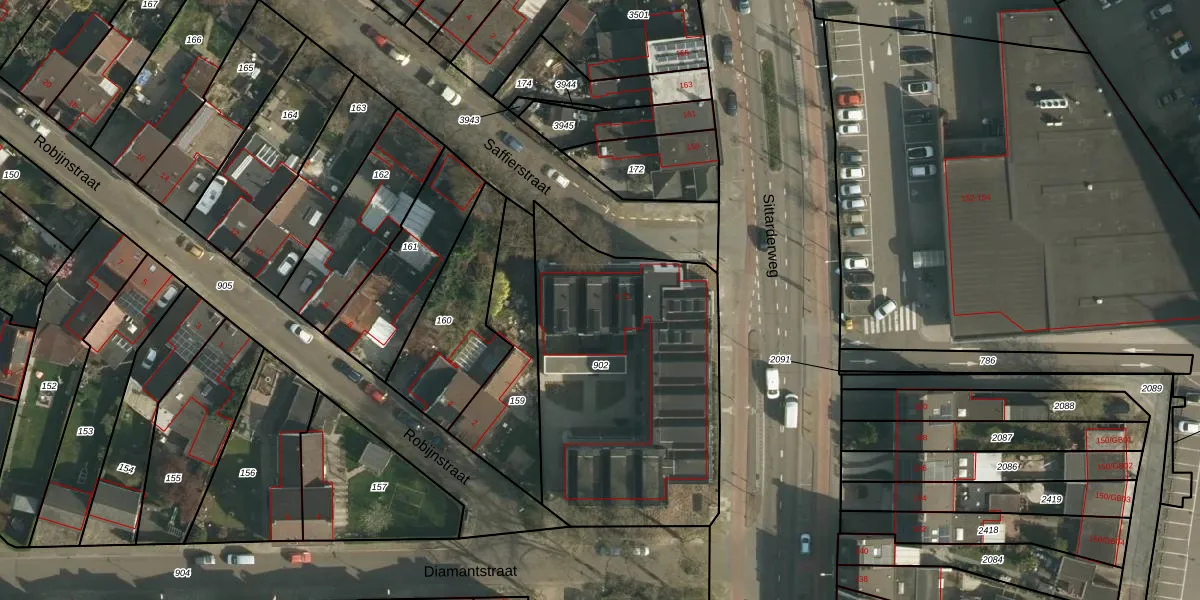 Het perceel waarop Saffierstraat 59 staat heeft een oppervlakte van 1375 m². Dit is een zeer groot perceel. De perceeloppervlakte wordt geregistreerd door het Kadaster. Gedetailleerde informatie over de maten van dit perceel kunt u vinden in het rapport Kadastrale kaart met maatvoering van Saffierstraat 59.