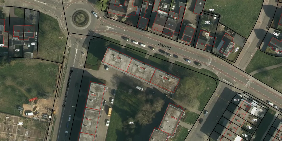 Het perceel waarop Uterweg 18 staat heeft een oppervlakte van 9020 m². Dit is een zeer groot perceel. De perceeloppervlakte wordt geregistreerd door het Kadaster. Gedetailleerde informatie over de maten van dit perceel kunt u vinden in het rapport Kadastrale kaart met maatvoering van Uterweg 18.